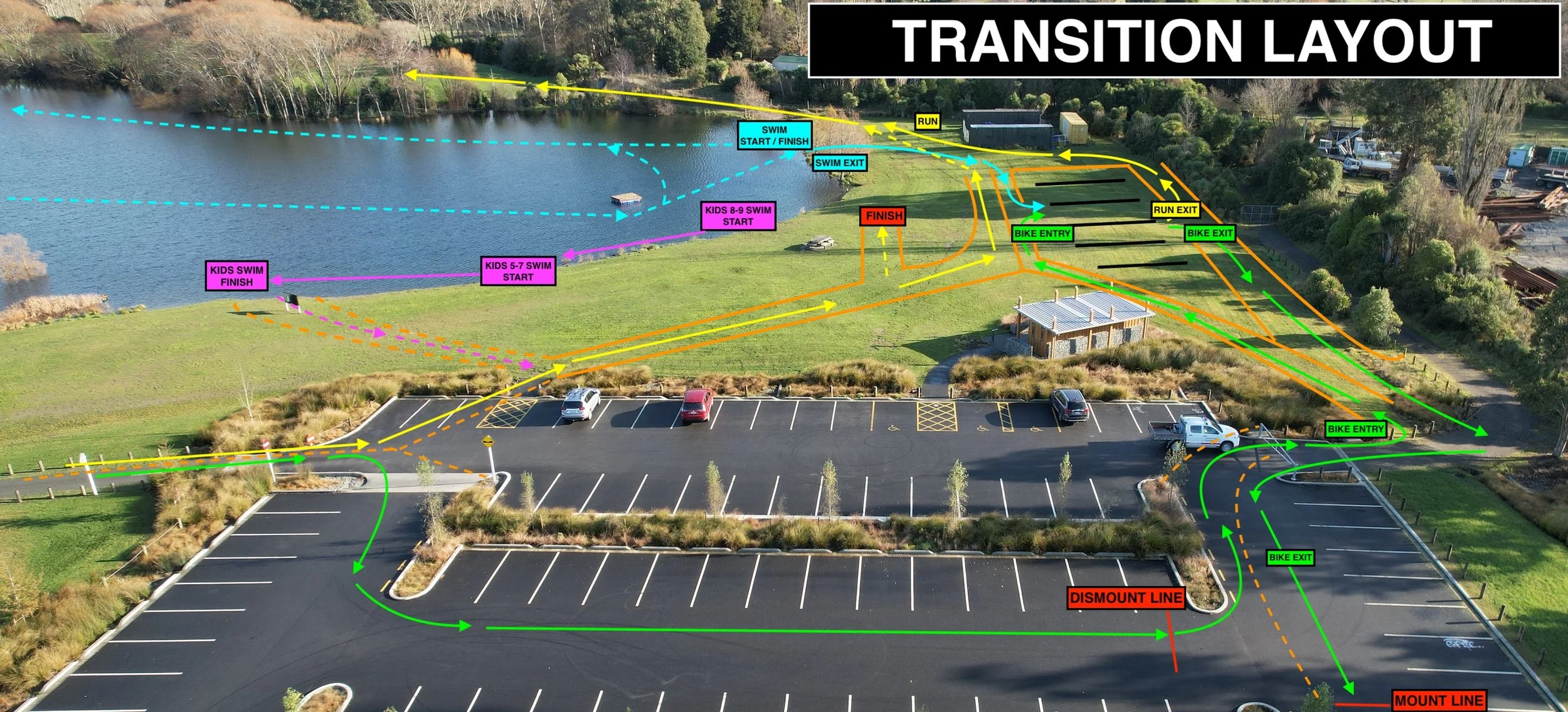The start will be near the swim start line. Complete 2 laps of the run course then enter the transition at the same entry point as the triathletes.